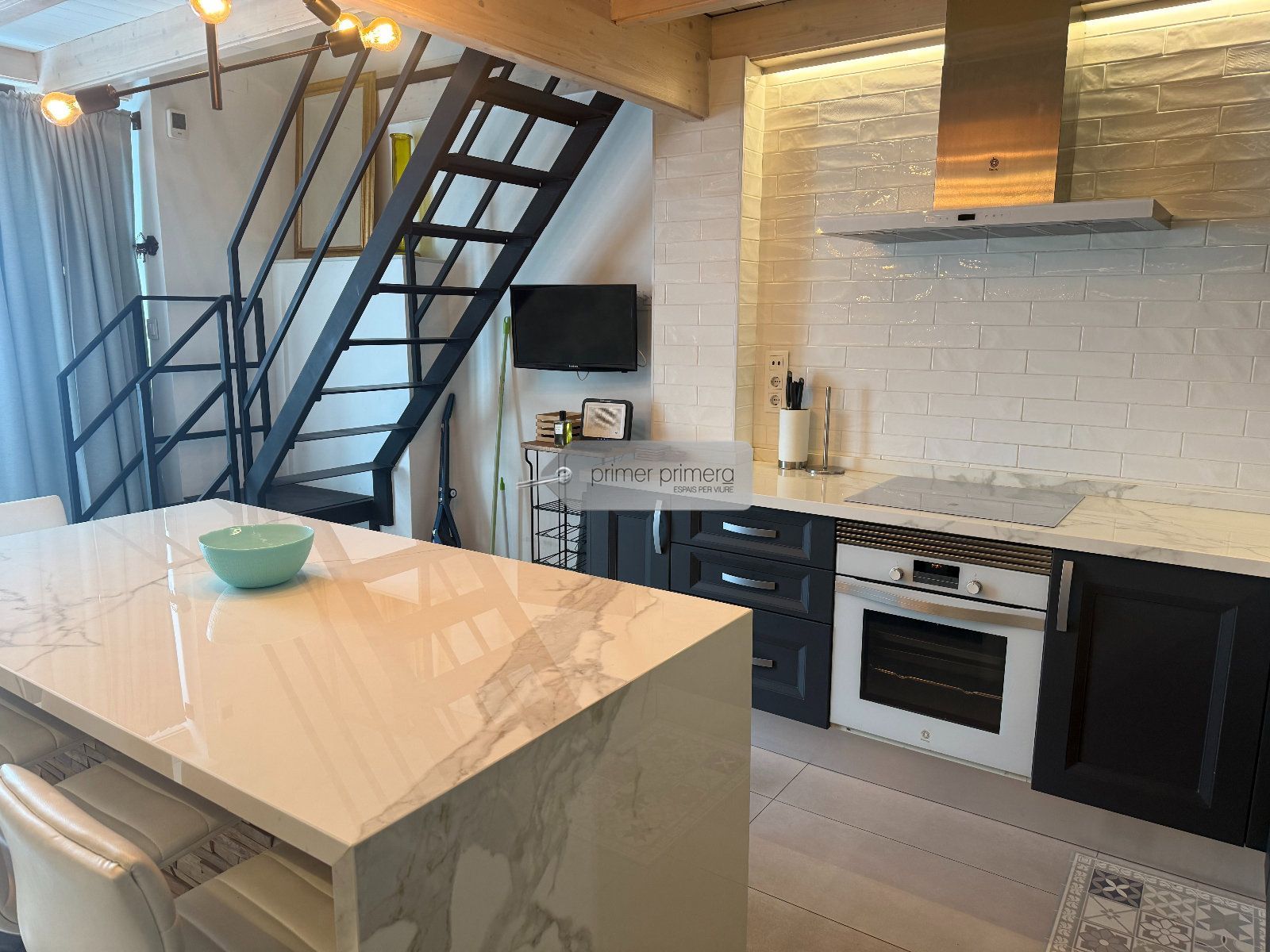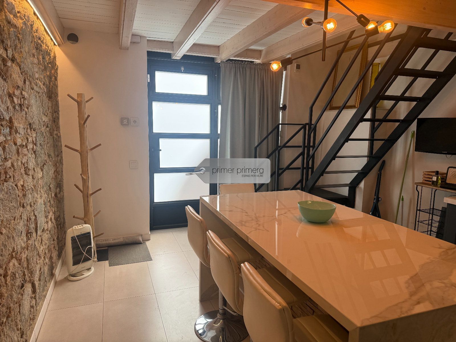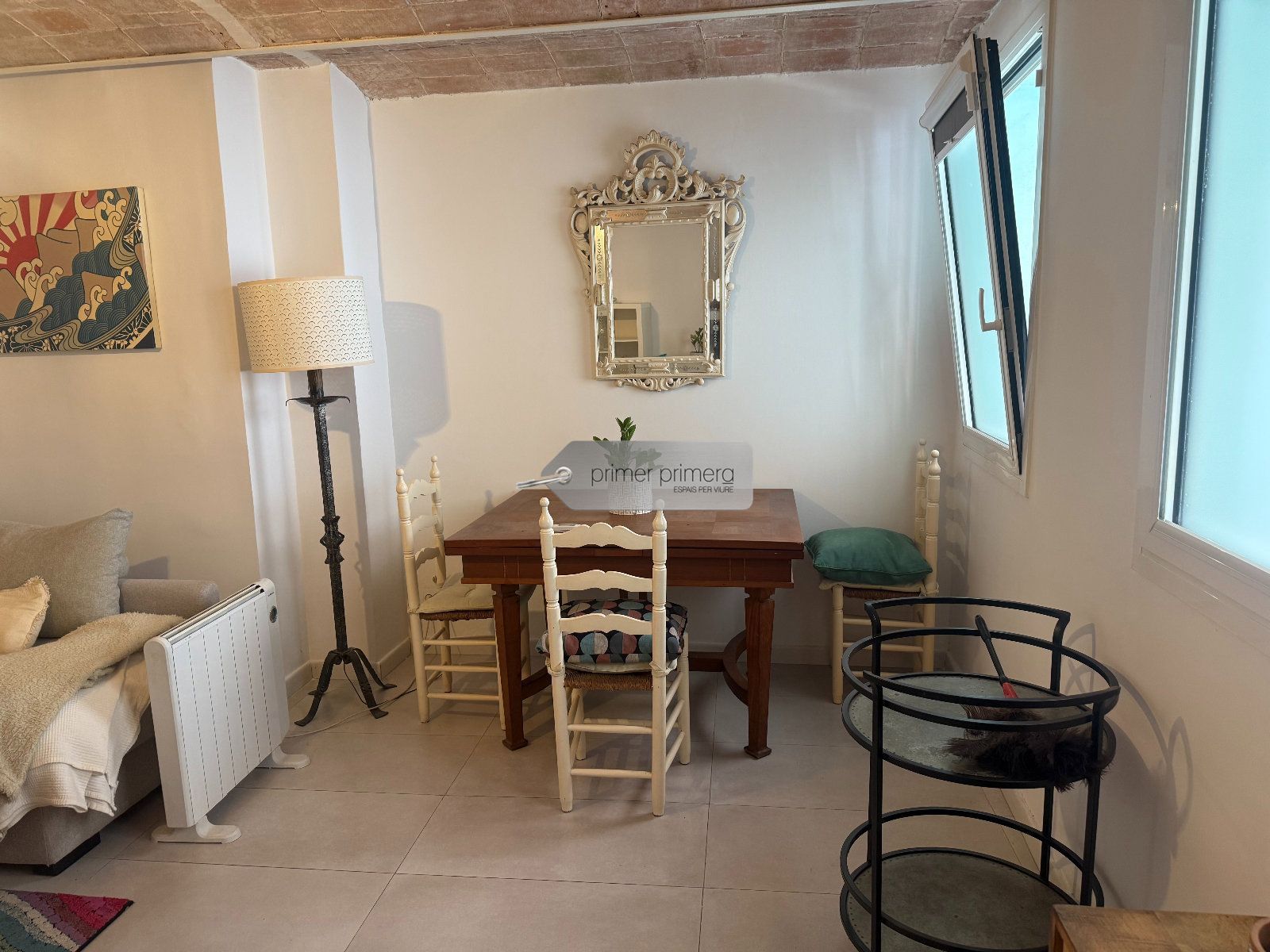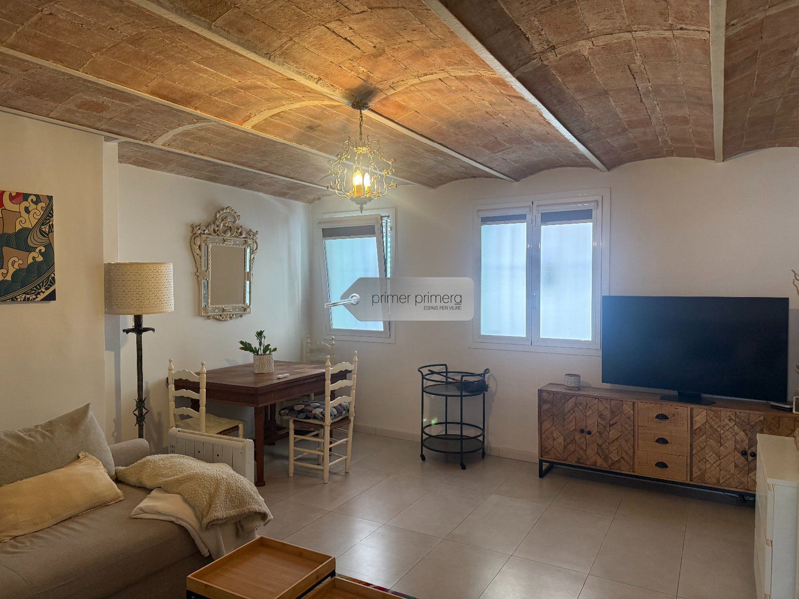 Dispone una una bonita cocina americana amplia con una peninsula que hace funcion de mesa, con todos los eloctrodomesticos y conservando una paret original del edificio, un baño completo con plato de ducha y una zona donde hay la lavadora y la secadora, y un gran salon comedor con aire acondicionado y se a conservado el techo con vuelta catalana original.