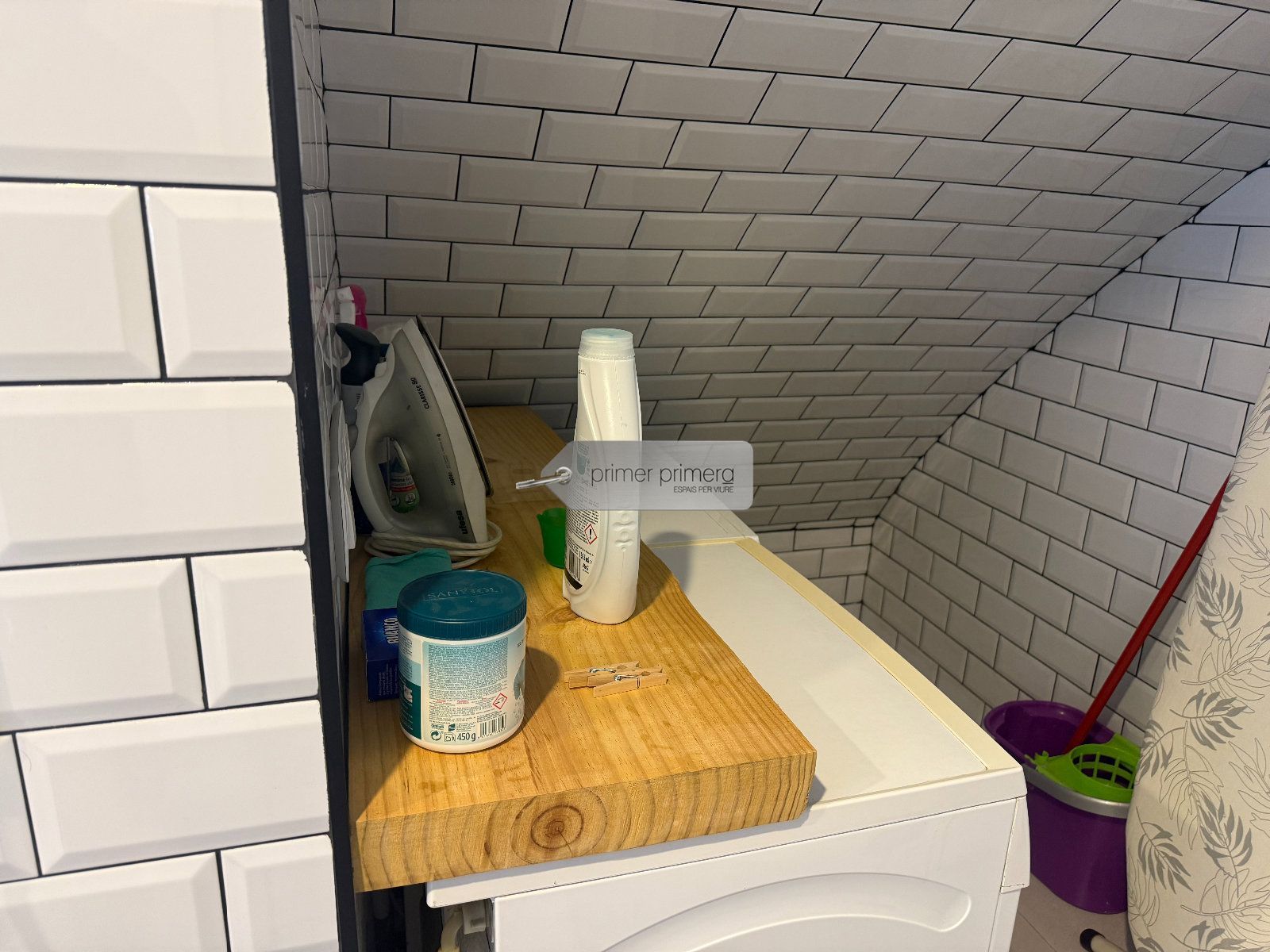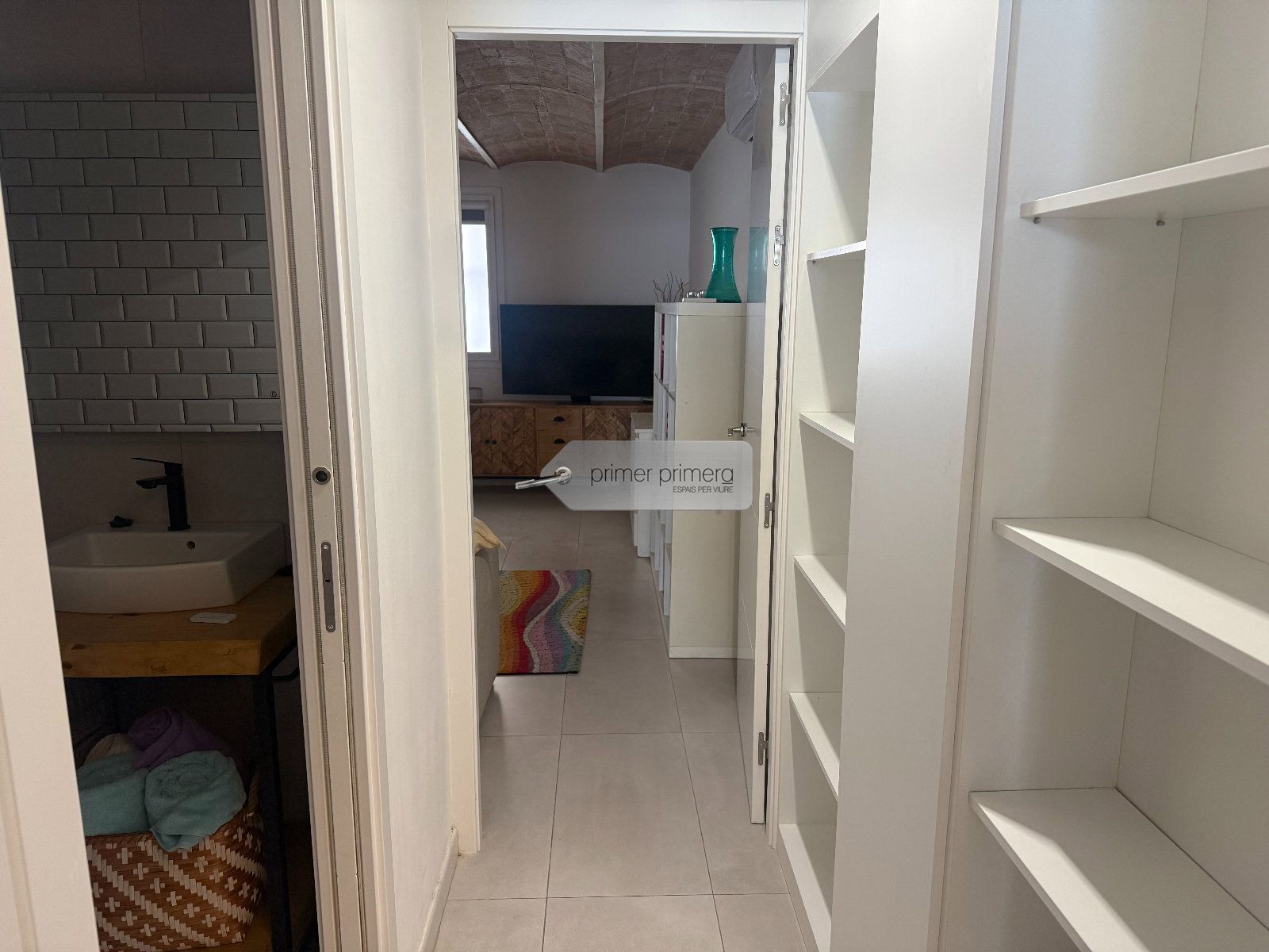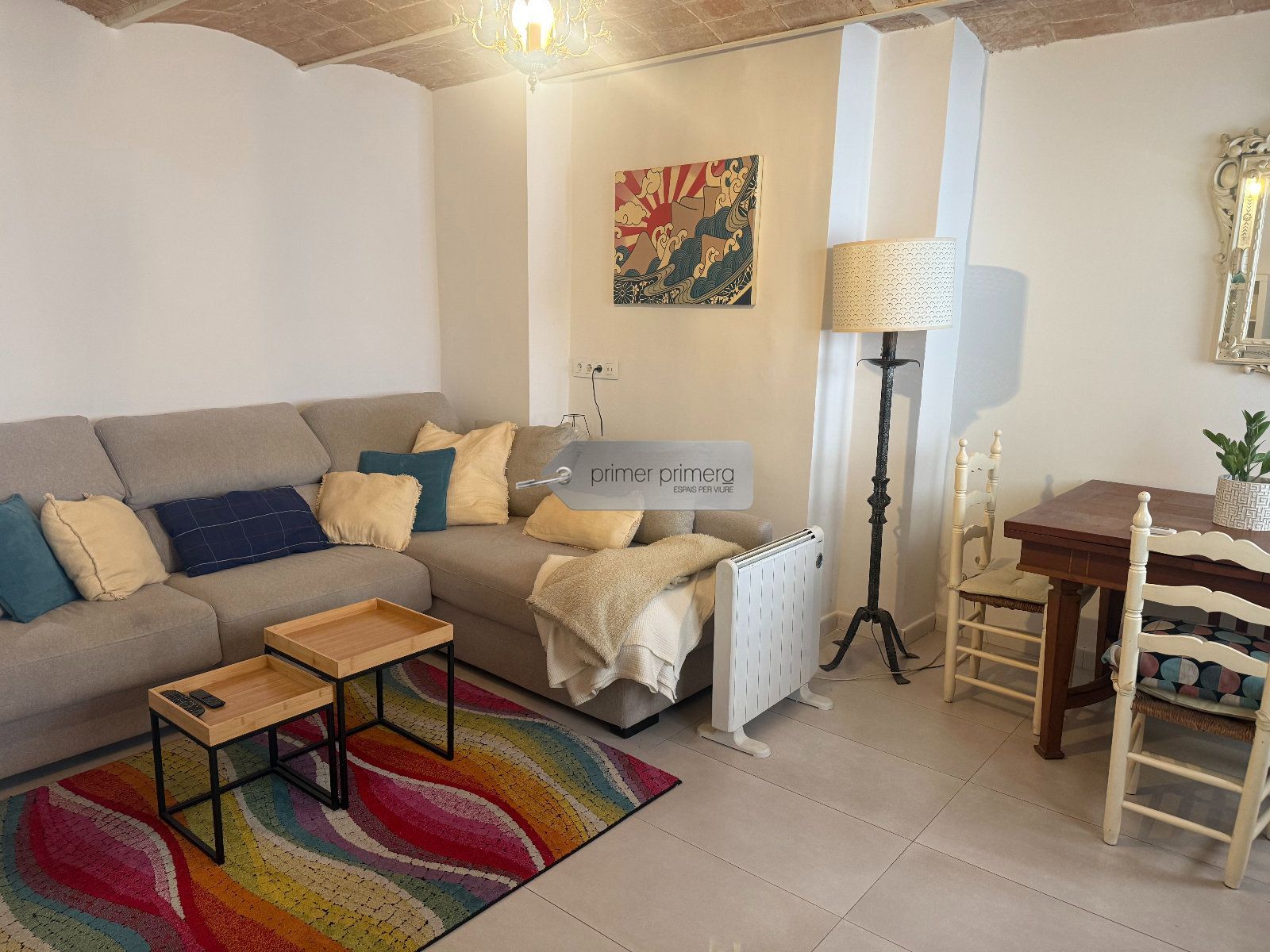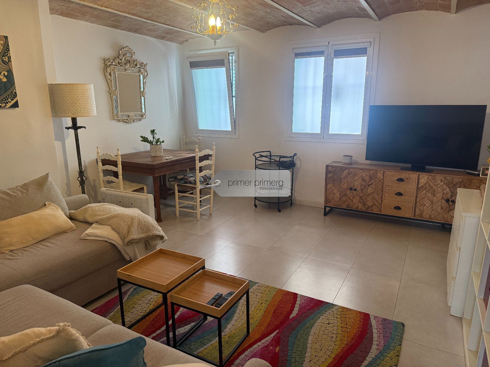 Dispone una una bonita cocina americana amplia con una peninsula que hace funcion de mesa, con todos los eloctrodomesticos y conservando una paret original del edificio, un baño completo con plato de ducha y una zona donde hay la lavadora y la secadora, y un gran salon comedor con aire acondicionado y se a conservado el techo con vuelta catalana original.