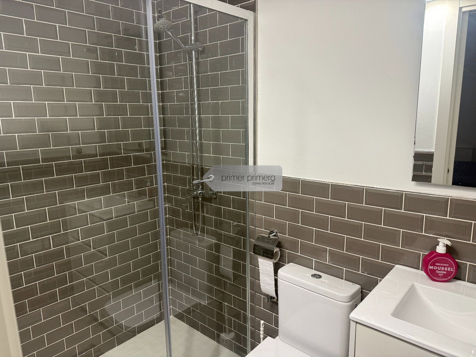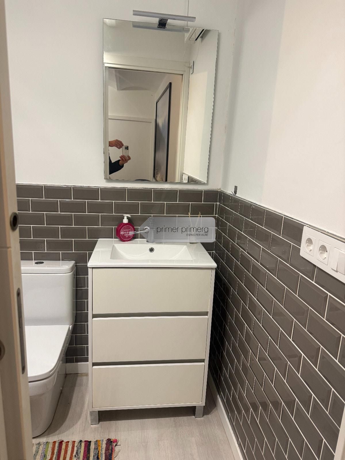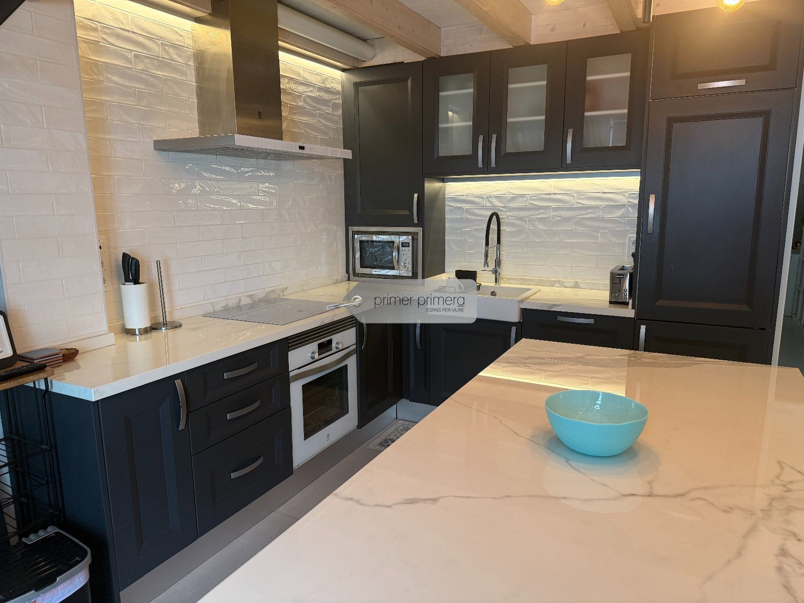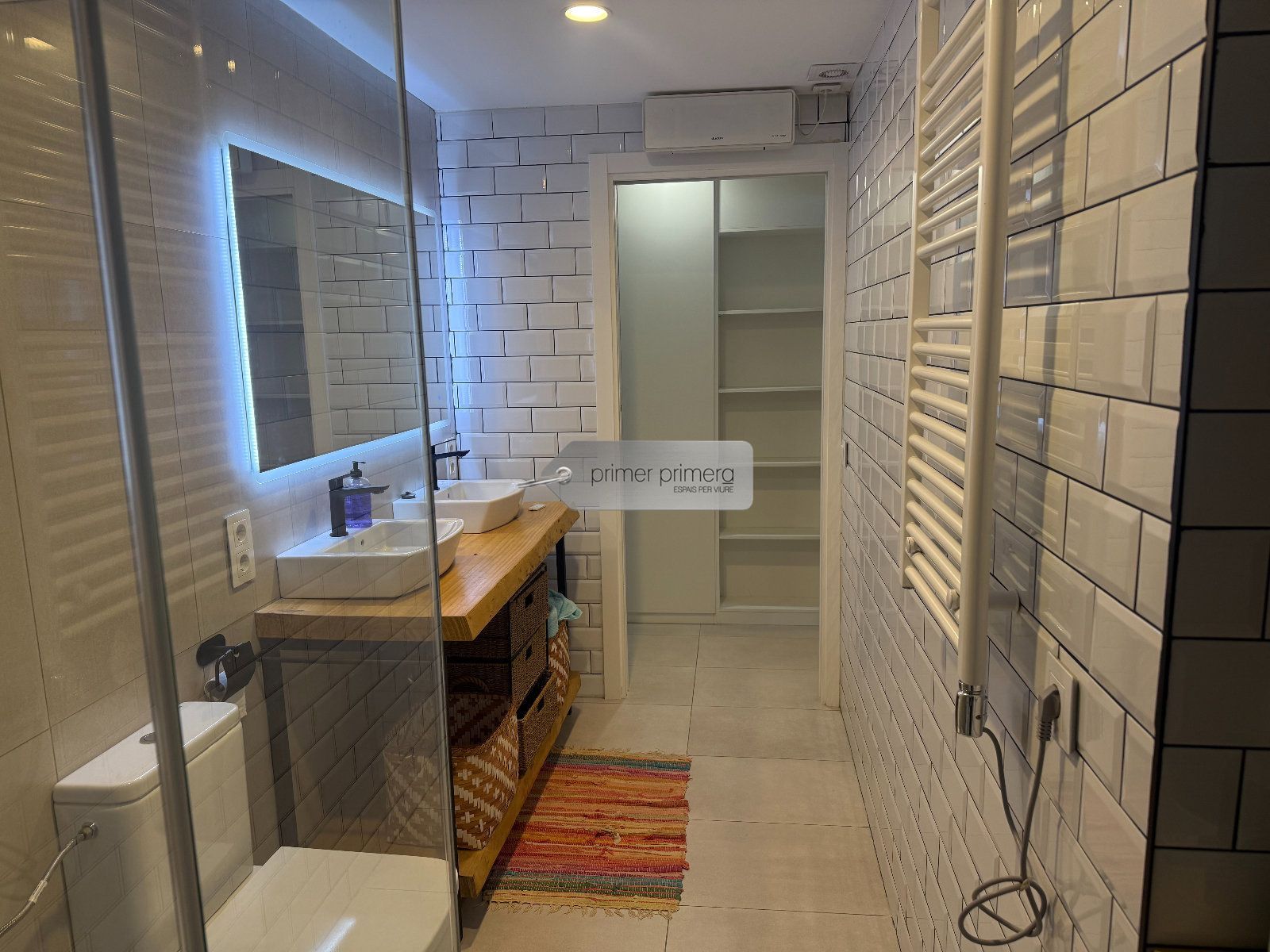 Dispone una una bonita cocina americana amplia con una peninsula que hace funcion de mesa, con todos los eloctrodomesticos y conservando una paret original del edificio, un baño completo con plato de ducha y una zona donde hay la lavadora y la secadora, y un gran salon comedor con aire acondicionado y se a conservado el techo con vuelta catalana original.